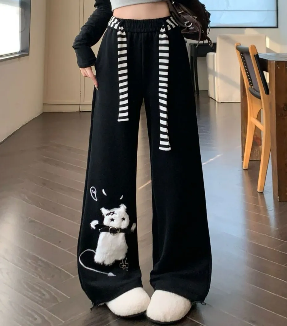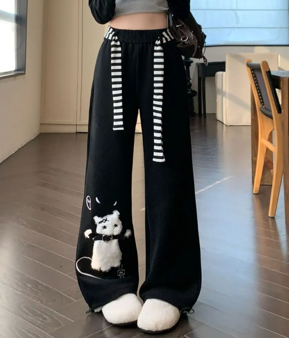 These playful wide-leg sweatpants combine comfort with a touch of whimsy. Designed with a soft cotton-blend fleece, they feature a high-waisted elastic fit and a relaxed silhouette perfect for lounging or casual outings. The standout cat embroidery and contrast stripe detail add a cute, streetwear-inspired flair, making them an easy statement piece for cozy days or expressive everyday style.